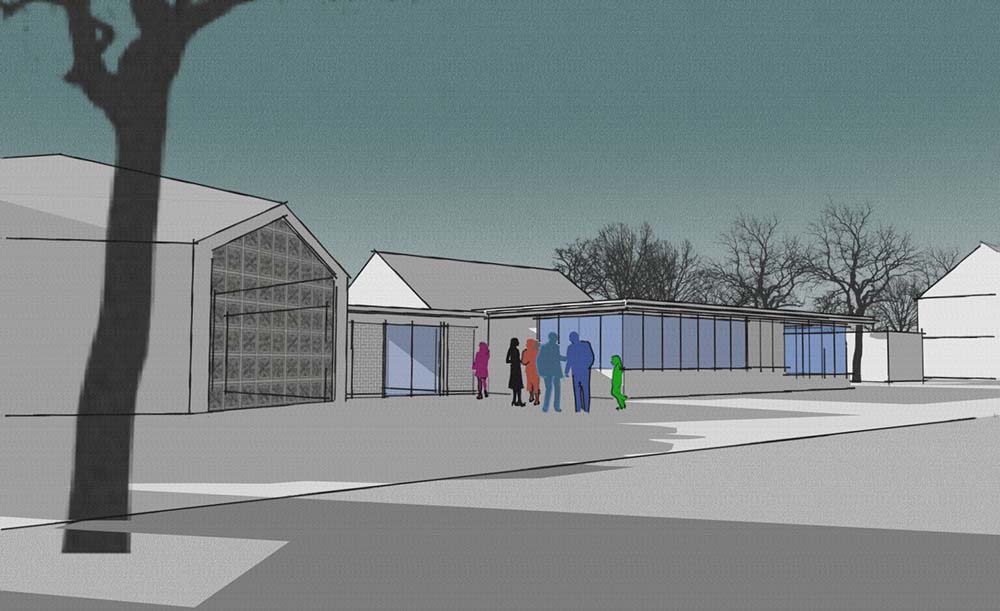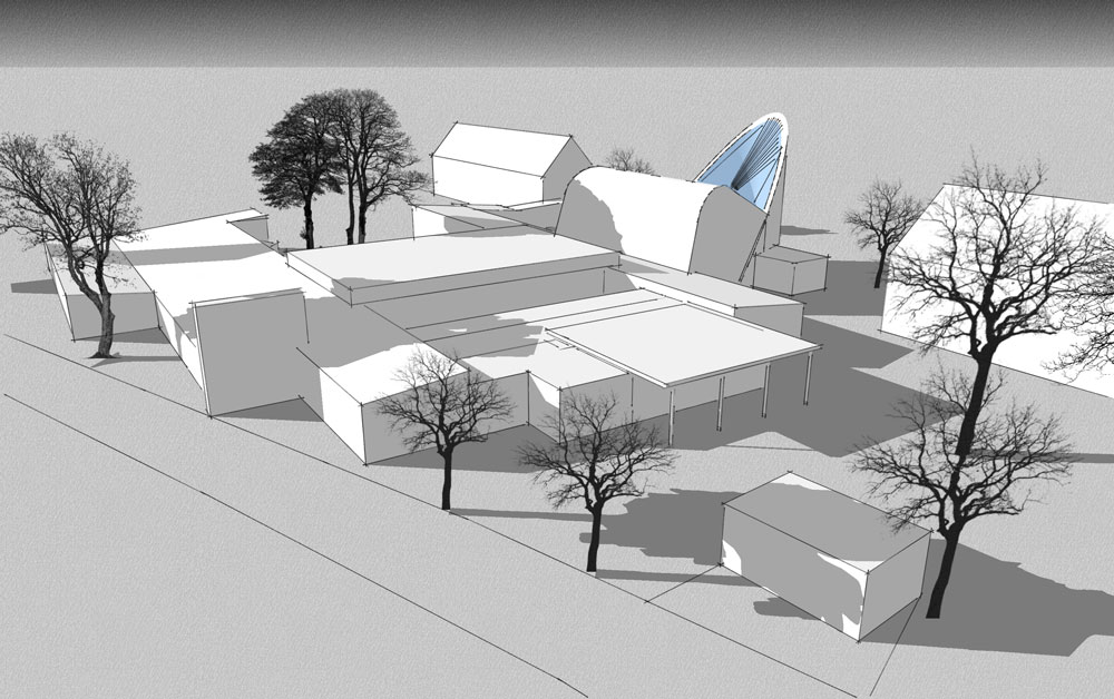 Aussegnungskapelle, Gemeinde- und Pastorenhaus behutsam mit einem Neubau zu ergänzen.