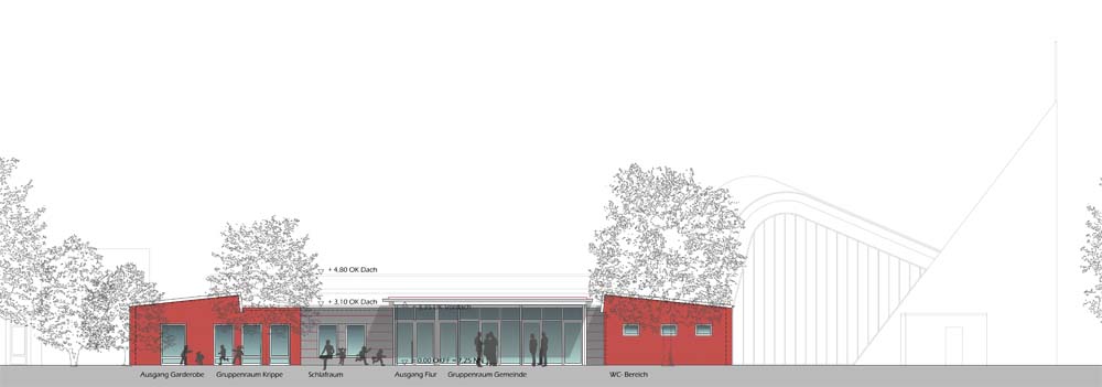 Neben der Modernisierung des Gemeindehauses wird die bauliche Situation im Norden des Gebäudes durch Abbruch und Neubau eines Gruppenraumes bereinigt.