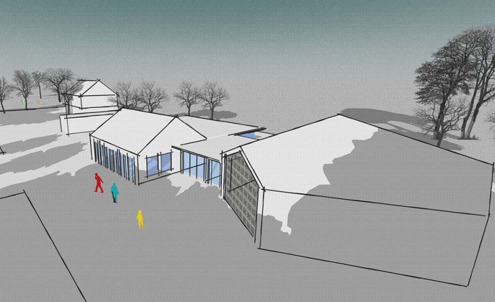 Nördlich der Außenwand entsteht ein neuer ebenfalls flachgedeckter Baukörper mit Verwaltungs- und Nebenräumen sowie einer großzügigen Küche.