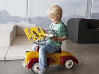 Auch im Innenraum der Gruppenräume spiegelt sich die "Ikone Haus" wider. Auf quadratischem Grundriss mit jeweils 7 m Kantenlänge sind zwei Gruppenräume bis zum First in ca. 6 m Höhe offen. Viertelkreisförmige Hochebenen spielen einmal stehend als "Burg"...