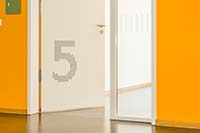 Zur Verbesserung der Raumatmosphäre im neuen Gruppenraum und dem Besprechungsraum werden statt der gartenseitigen Fenster Fenstertüren eingebaut. Das Foyer wird über eine Glaswand zum Garten hin geöffnet.
